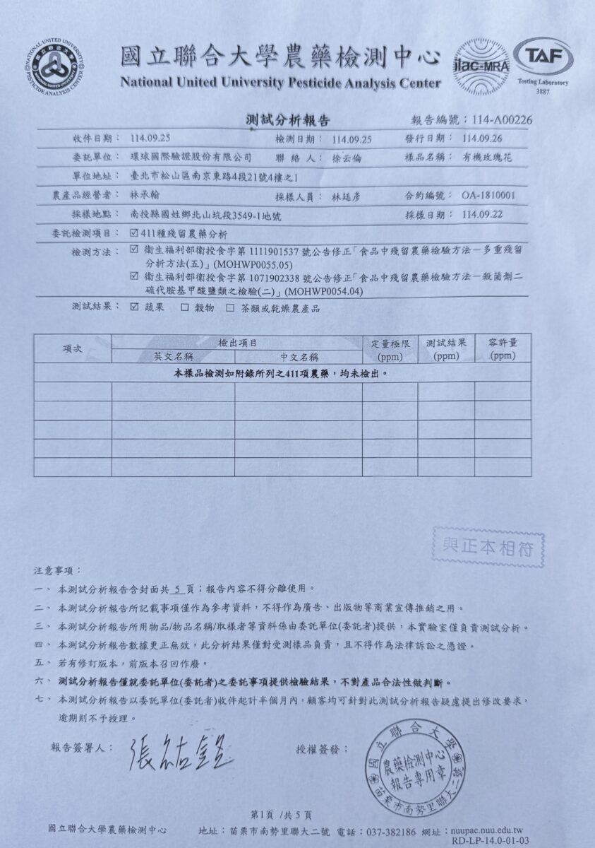 我們的玫瑰通過國立聯合大學農藥檢測中心嚴格檢驗,411項農藥殘留全數「未檢出」,符合有機標準。從土壤到花朵,堅持零農藥、零化肥栽種,每一株玫瑰都是大自然最純淨的恩賜。這份檢驗報告,是我們對品質的承諾,也是給你最安心的保證。