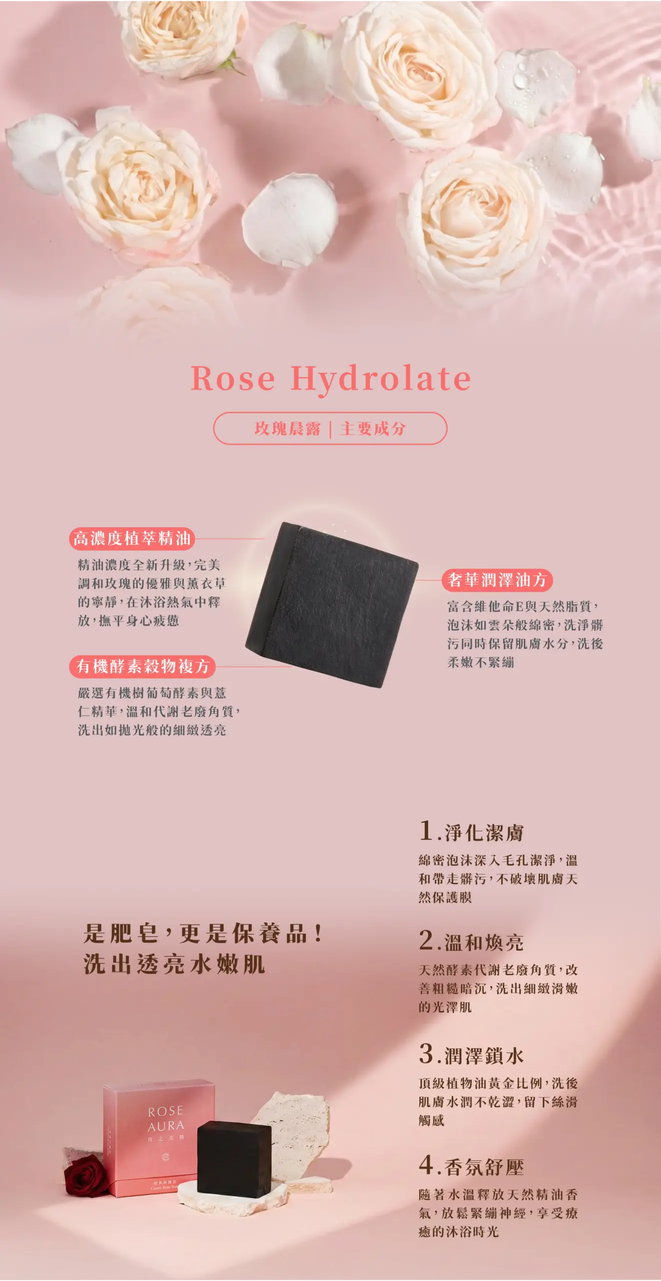 Rose Aura 經典玫瑰皂特別選用多種天然純淨精油調和而成,空氣中瀰漫著療癒的植物香氣,彷彿置身於清晨的花園。特別添加了有機樹葡萄酵素與薏仁精華,經過中性水質環境下的嚴格實測,確保在純淨的水質下,依然能展現極佳的親膚性。溫和帶走污垢,卻不帶走肌膚必要的油脂。洗臉後不僅沒有緊繃感,更能感受到肌膚表面留下一層隱形的**「潤膚油膜」**。只留下絲緞般的觸感與讓人安心的淡雅幽香。